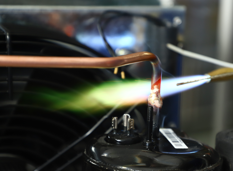 可選用銀銅焊料和適當(dāng)?shù)暮竸?,焊后必須將焊口附近的殘留焊劑用熱水或水蒸氣刷洗干凈,防止產(chǎn)生腐蝕。在使用焊劑時(shí)最好用酒精稀釋成糊狀,涂于焊口表面,焊接時(shí)酒精迅速蒸發(fā)而形成平滑薄膜不易流失,同時(shí)還可避免水蒸汽浸入制冷系統(tǒng)。